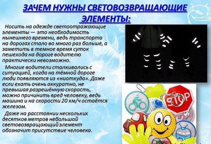 Все проведённые мероприятия - беседы, классные часы, минутки безопасности с использованием обучающих мультипликационных фильмов, видеороликов данной тематики, были посвящены безопасности пешеходов, популяризации применения детьми световозвращающих элементов.